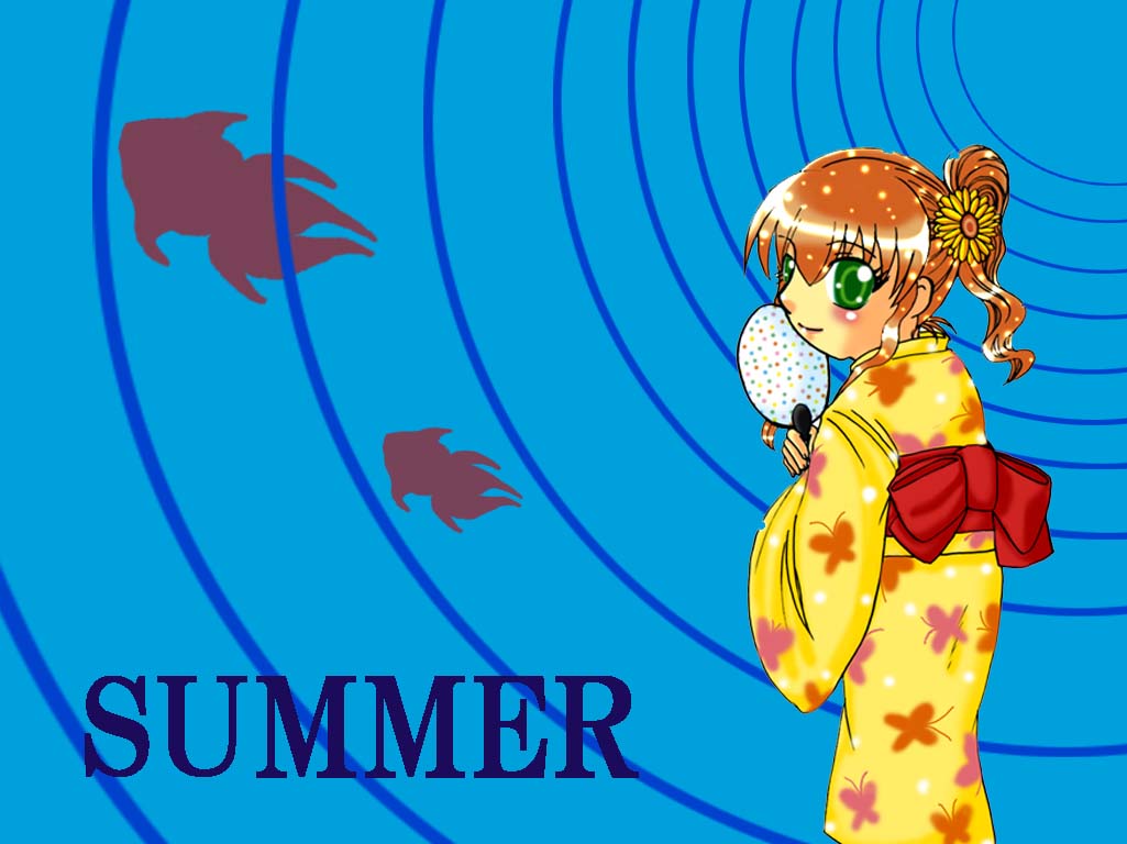 残暑お見舞いに書き下ろした浴衣姿のまりもちゃん。 ちょっぴり大人びた表情になってるような気が…。 2005年はまとめ髪に大きなお花をつけるのが流行していたので ひまわりをつけてみました。彼女のイメージは向日葵。 花言葉は「あなたは素晴らしい」らしい。 背景の波紋と金魚が涼しげでお気に入り。残暑だけど(汗) ■デスクトップサイズ □ノートサイズ |